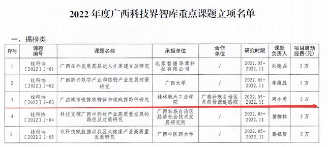 近日,广西壮族自治区科协公布了2022年度广西科技界智库重点课题立项名单,公司有2个项目喜获立项,其中周小勇副经理主持的“广西城市碳排放特征和碳减排路径研究”获得了揭榜类立项项目,马亨国博士主持的“广西西江流域生态环境状态动态评价研究”获得了培育类立项项目,其中,周小勇负责的项目为公司、公司首次获得自治区科协揭榜类课题。本年度自治区科协公布的科技界智库重点课题立项共85项,其中揭榜类5项,培育类80项。