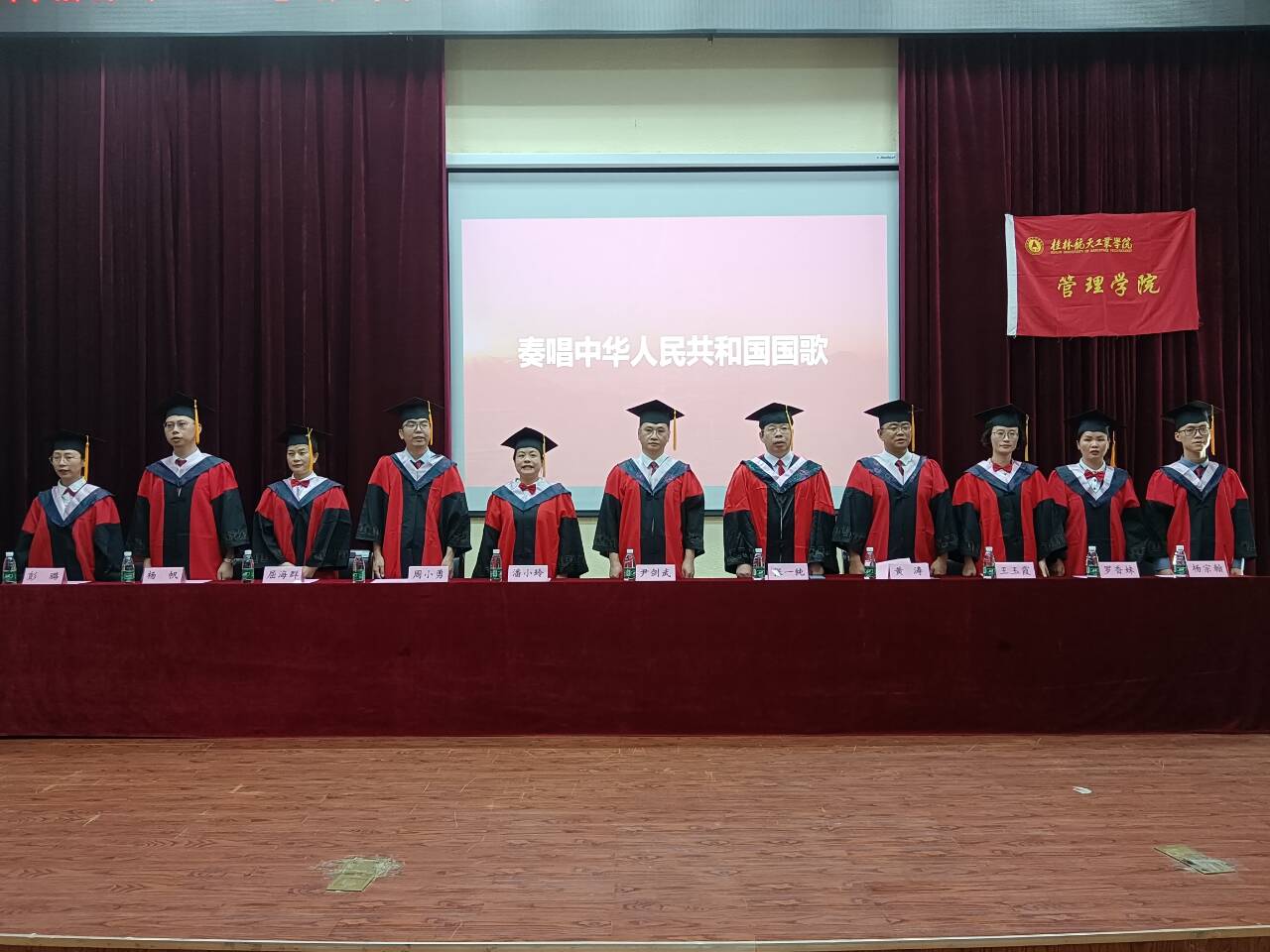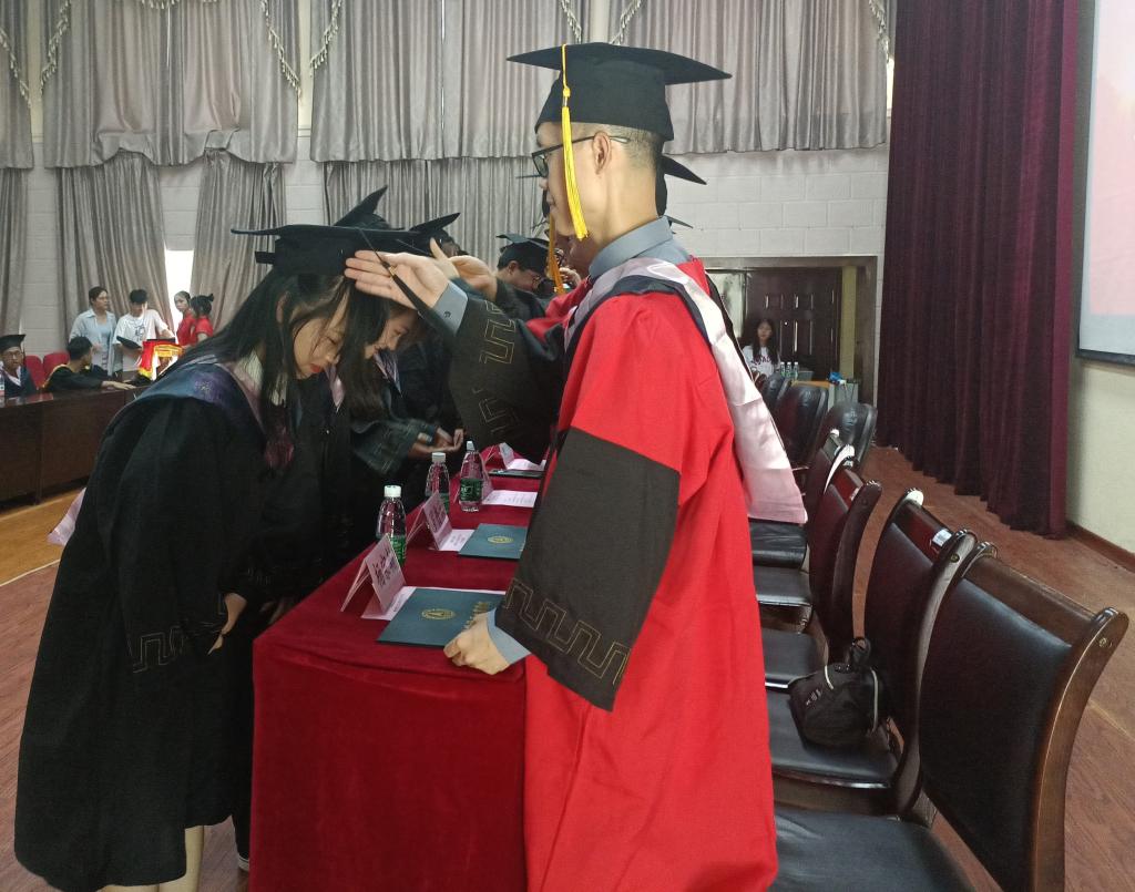 伴随着拨穗仪式进行曲,毕业生代表依次登台,老师们同每一位毕业生握手、祝贺、拨穗、正冠、授位、合影,毕业生们向老师深情鞠躬、回礼致谢,现场气氛温馨热烈。