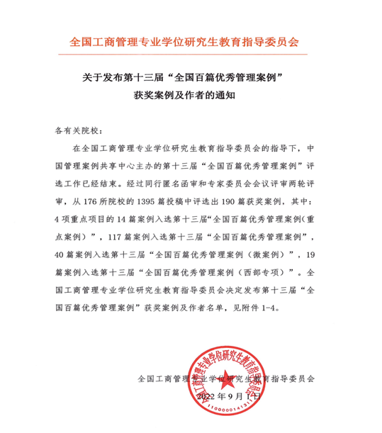 据悉,“全国百篇优秀管理案例”是中国管理案例的最高奖项,自2012年教育部公布“第三轮学科评估指标体系”起,正式列入全国高校“工商管理”一级学科评估标准(C5项)。“全国百篇优秀管理案例”每年评选一次,入选的优秀管理案例质量要求与国际接轨,并由中国管理案例共享中心和加拿大毅伟商学院(Ivey Business School)合作出版面向全球发行。本届评选于2022年3月21日启动,共收到来自全国176所院校的1395篇投稿。根据各院校的推荐及组委会遴选、自主邀请,95所院校的295位专家参与了函审工作,每篇案例请3位评审专家进行匿名函审。最终68所院校的117篇案例入选第十三届“全国百篇优秀管理案例”,15所院校的19篇案例入选第十三届“全国百篇优秀管理案例(西部专项)。